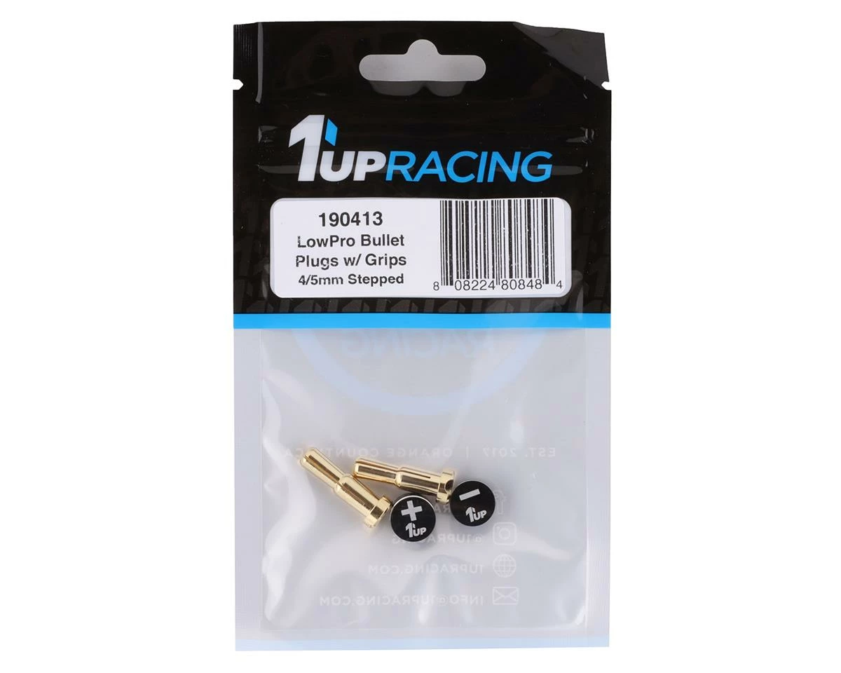 1UP Racing 4-5mm LowPro Bullet Plugs with Bullet Grips. These are perfectly paired to add to any charge lead where you need 4mm or 5mm bullets. Included with these are the LowPro Bullet Plug Grips. These are a great way to quickly identify your positive and negative leads.Â