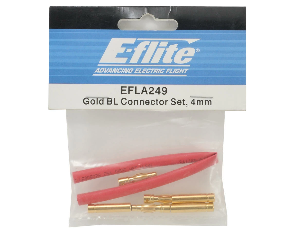 This is a E-flite 4mm Gold Bullet Connector Set. This set includes three male 4mm connectors and three female 4mm connectors, as well as a length of heat shrink tubing.Â