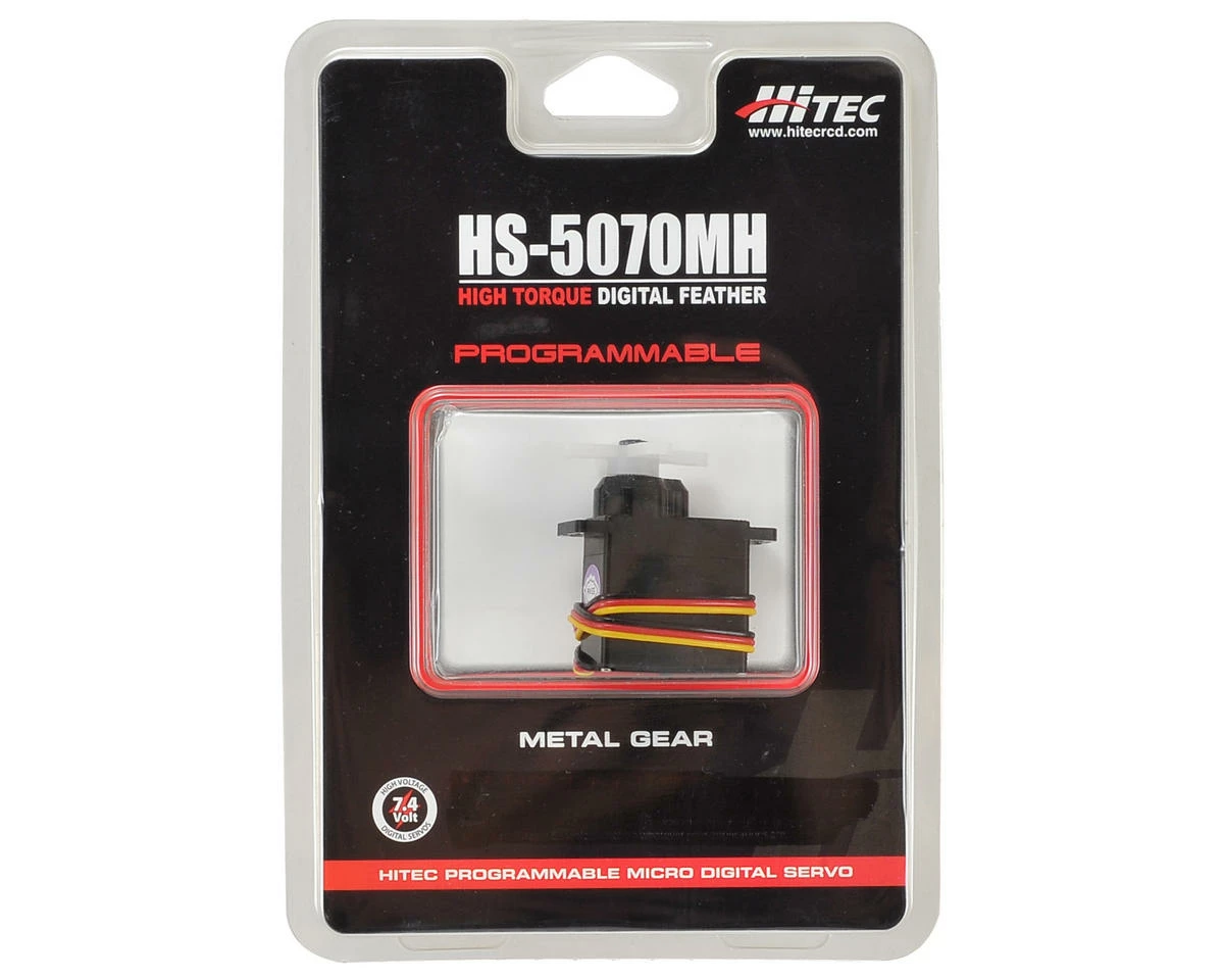 This is the Hitec HS-5070MH Digital HV Ultra Torque Metal Gear Feather Servo. The HS-5070MH possess the performance qualities necessary for 42-48 inch performance 3D aircraft and 450-size helicopters. Featuring Hitec’s durable metal gears, cored motors, top ball bearings and Generation 1 circuitry, these additions to the Hitec servo family will have all your planes and helis flying with remarkable precision and power. The programmable HS-5070MH delivers an impressive 53 oz.-in. of torque at 7.4 volts.