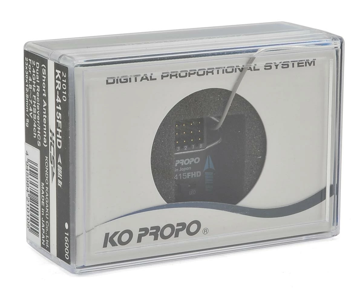 This is the KO Propo KR-415FHD 2.4GHz FHSS Micro Receiver with a short antenna. The KR-415FHD achieves a highly precise receiving performance with the use of a dual circuit and an external and internal antennas. With less of chance of missing a packet of info from the transmitter the result is a very smooth and linear feel.