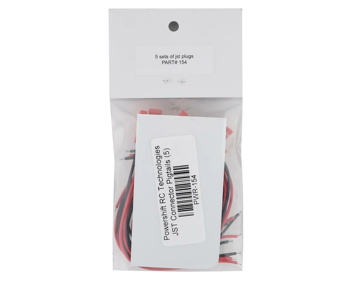 This is a pack of five Powershift RC Technologies JST Connector Pigtails. Package includes five male JST pigtails, and five female JST pigtails, all pre-tinned and ready for installation in your custom application.Â