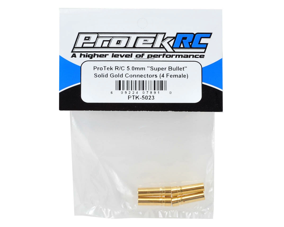 This is a pack of four female ProTek R/C 5.0mm “Super Bullet” Solid Gold Connectors. The ProTek R/C “Super Bullet” Solid Gold Connectors are an absolute must for high current / high voltage applications! With lower resistance than a typical T-style plug and traditional spring-type bullet connectors, they are the new standard for brushless applications. They can be used for battery connectors that require a 5mm bullet, as well as motor to speed control connectors.Â