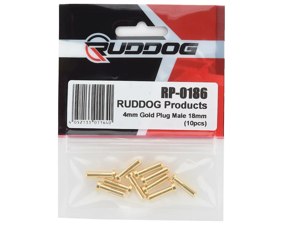 This is a pack of ten Ruddog 4mm Gold Bullet Plugs. These male plugs are 4mm diameter and 18mm long. Â