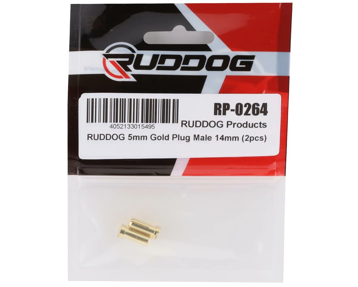 This is a pack of two Ruddog 5mm Gold Bullet Plugs. These male plugs are 5mm diameter and 14mm long.