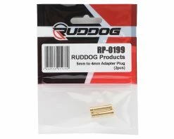 This is a pack of two Ruddog 5mm to 4mm Bullet Adapters. These adapters go into a 5mm hole and shrink it to 4mm size.