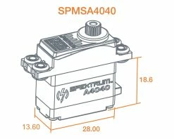 The Spektrum RC A4040 MT/HS Micro Metal Gear Servo is a great option for high performance smaller sport planes (15-25 size). High voltage capable, this servo can produce 96oz of toque at 0.094sec/60° with 8.4V input. A low wear metal gear drive train is supported by a single ball bearing for smooth operation. Completing the build is a center aluminum band for added reliability and durability. Take to the skies with the Spektrum RC A4040 servo.