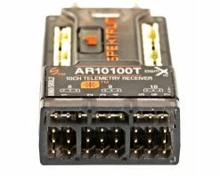 The AR10100T DSMX/DSMN2 10 Channel Telemetry Receiver from Spektrum RC is a compact receiver that supports a host of advanced level features to suit the needs of a wide variety of pilots. It boasts full range telemetry, an included barometer, a built in bind button, and an onboard micro USB port for quick connection to the Spektrum RC PC Programmer and it’s application. With the ability to connect with up to two additional SRXL2 remote receivers (such as SPM9747, or SPM4651T), receiver performance will be incredibly high thanks to not only the two on board antennas, but the option to add additional receivers for the best reception in any aircraft. Spektrum SMART users will also enjoy SMART functionality for SMART equipped ESCs that feature one wire telemetry data without the need of modules, links, or wires.Â