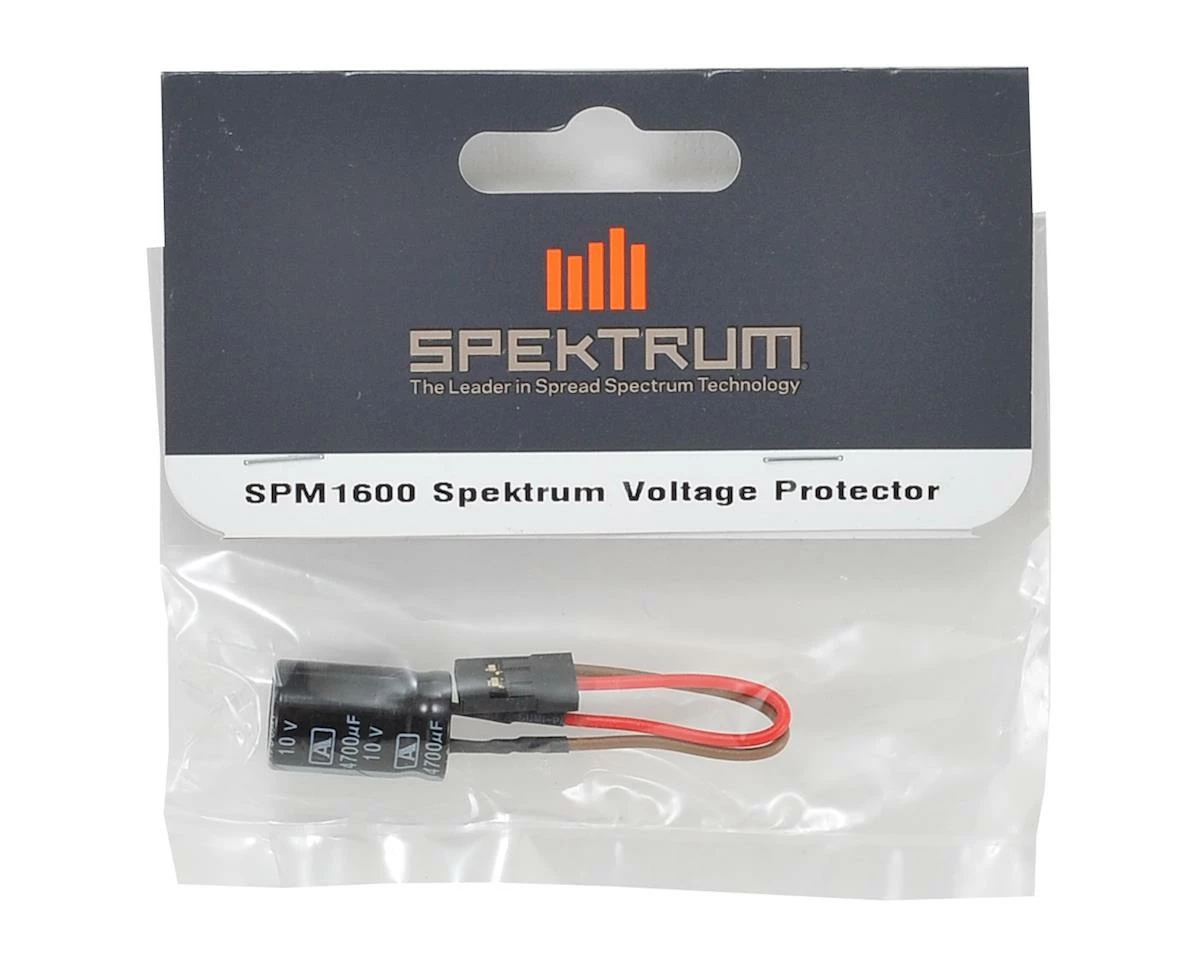 This is the Spektrum voltage protector capacitor. In order to make sure your Spektrum receiver always has the correct voltage, you can use this power capacitor to smooth out the voltage to the receiver. This will help avoid spikes in the receiver battery voltage due to your servos needing large pulses of current.