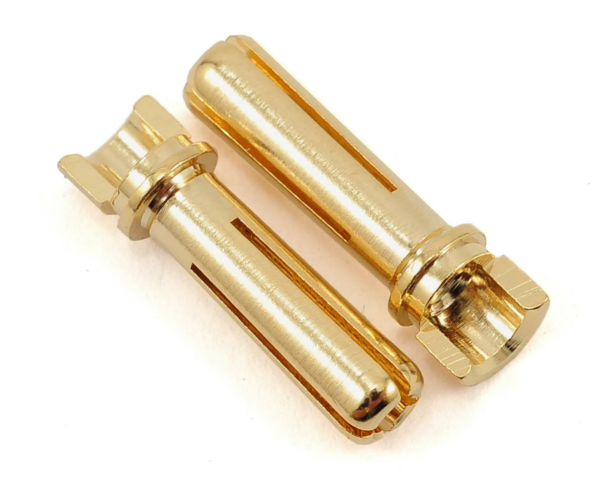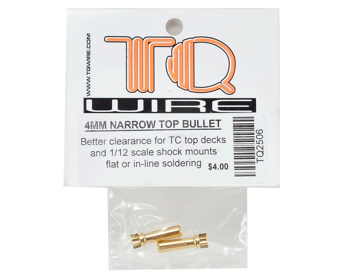 This is a pack of two TQ Wire Gold 4mm Narrow Top Male Bullet Connectors. These connectors feature a better clearance for Touring Car top decks and 1/12 scale shock mounts. Ideal for flat or in-line soldering.Â